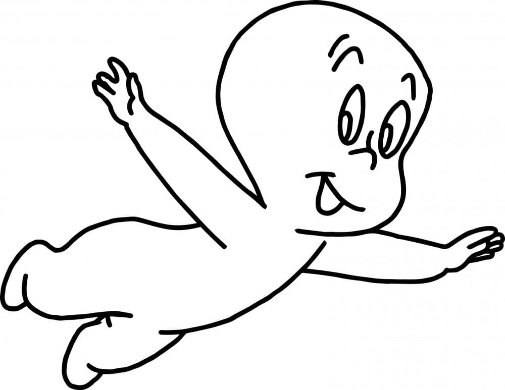 This delightful coloring page features a cheerful, flying ghost character, perfect for kids and adults alike! Set against a clean background, this cute ghost is depicted with a broad smile and outstretched arms, ready for adventure. The outlines are bold and clear, making it easy for anyone to fill in the details with colors of their choice.