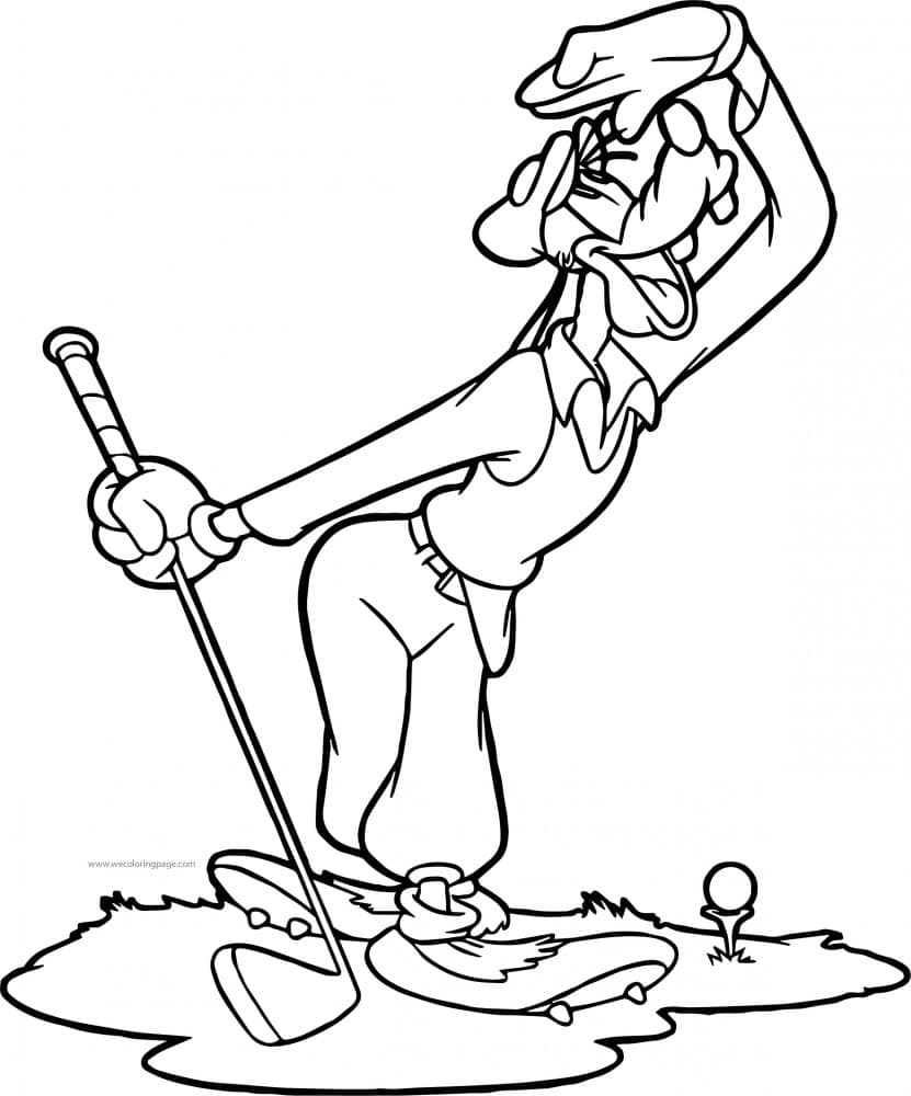 Discover this delightful coloring page featuring Goofy, a beloved character known for his clumsy charm. This illustration captures Goofy mid-swing while playing golf, offering a fun scene that is perfect for all ages. The image includes Goofy wearing his classic golf attire, complete with a cap and a long-sleeved shirt, all set against a simple golf course background with a small flower and a golf tee.