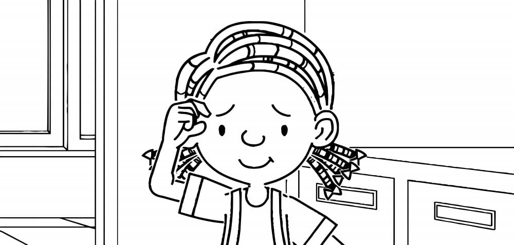 Discover our delightful coloring page featuring a cheerful character in a cozy interior setting, perfect for kids and adults alike! This printable coloring page showcases a young girl with unique braided hair, standing confidently and smiling. The background hints at a homely environment, with cabinets and an inviting atmosphere, making it an ideal choice for creative expression.