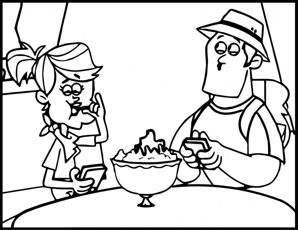 In this charming illustration, we see a girl with a playful expression, seemingly sharing an amusing thought while tapping on her phone. She has a ponytail and casual attire, reflecting a relaxed atmosphere. Next to her, a boy dressed in a hat and T-shirt holds his device, fully absorbed in what he’s doing. Between them sits a bowl filled with a delicious-looking dessert, inviting anyone who colors it to bring a splash of color to this cheerful scene.