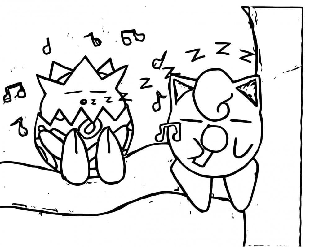 This delightful coloring page features two adorable cartoon characters in a peaceful setting, perfect for both kids and adults who enjoy relaxing with art. The scene depicts a charming, sleeping creature nestled in a cozy egg, accompanied by a playful character happily playing a musical instrument. Surrounding them are whimsical musical notes and peaceful z's, emphasizing the serene atmosphere.