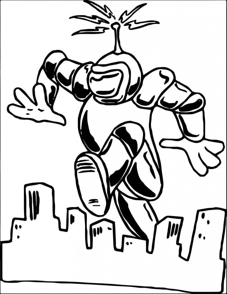 This printable coloring page features a dynamic and playful robot character, poised in a running stance against a city skyline backdrop. The robot showcases a sleek design with a rounded head, large expressive eyes, and a fun antenna that emits zigzagging signals, indicating its energetic personality. Its muscular limbs are clad in armor-like plating, reflecting a mix of futuristic and playful styles, making it an engaging subject for both kids and adults.